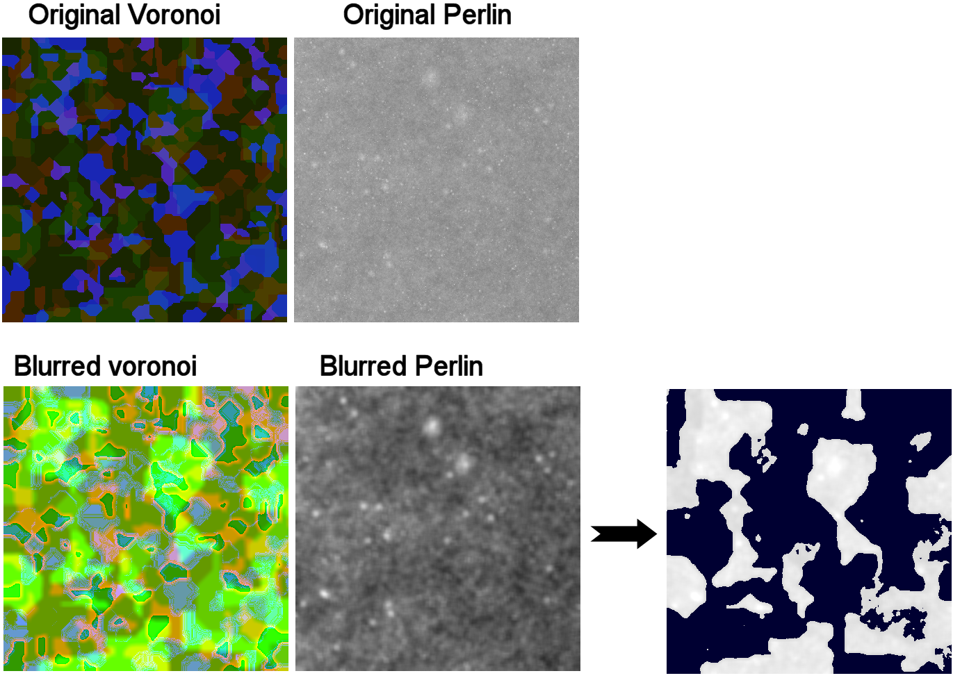 At this point I had some major issues with the level of randomness in my original data. It seemed like I was mostly getting either too large mega-continents or isolated blob islands. In addition, due to my Voronoi distance function my Voronoi cells were somewhat rectangular, forming nasty shapes. I solved this by writing an OpenCL blur kernel and, for both Voronoi cells and Perlin noise, performing a wide gaussian blur (10-20 pixels in radius). Then I combined the textures the same way: