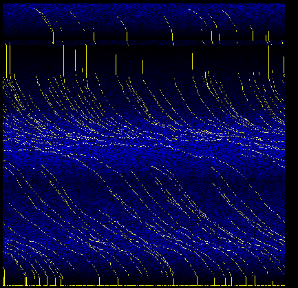 Near complete version. The yellow lines are a few chosen simulation points that I asked my program to solve. The points were placed at arbitrary locations, and continued to follow the winds for 1000 steps. The implementation in OpenCL.