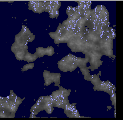 As the precipitation, and thus rainfall, was generated rivers seemed trivial. I didn’t expect quite as many complications as I ended up having. Turns out that the dynamics of falling water can get extremely hairy. I simplified and simplified the problem until I arrived at a decent result.